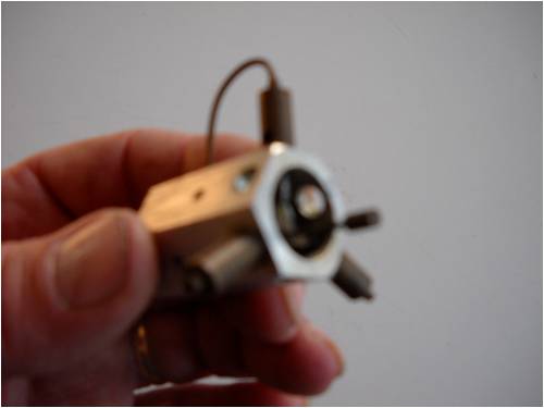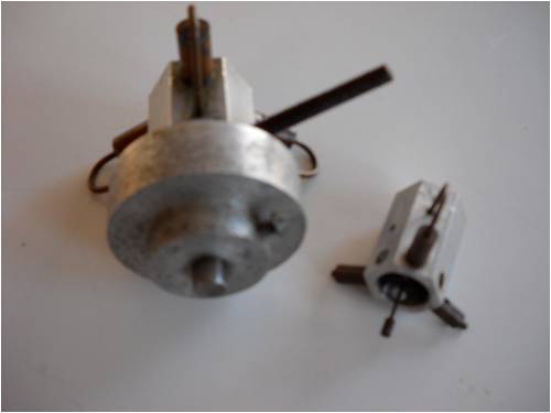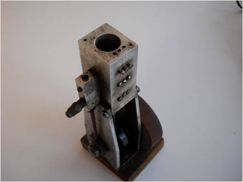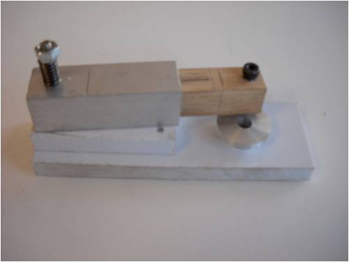 This is one of a number of engines I made using "off the shelf" stuff. The idea was to design an engine that almost anyone with a few hand tools could make, without needing a lathe or mill. By the way, I use an "end mill" mounted in my lathe chuck and the "table" attaches to the cross feed. Again, very small stuff. Oh, back to this picture: the piston is a piece of oak and the cylinder is extruded aluminum square stock. This is called an "oscillating" engine. It pivots on the spring-loaded stem. The inlet and outlet are the same hole in the cylinder, but different in the block.