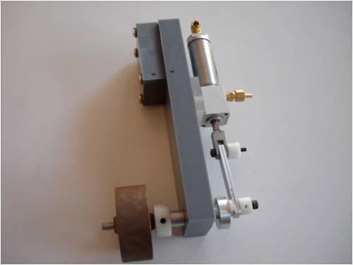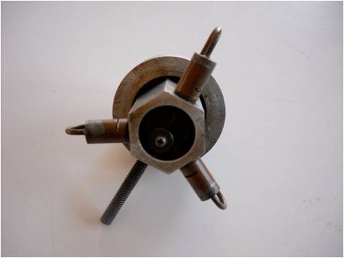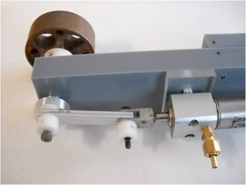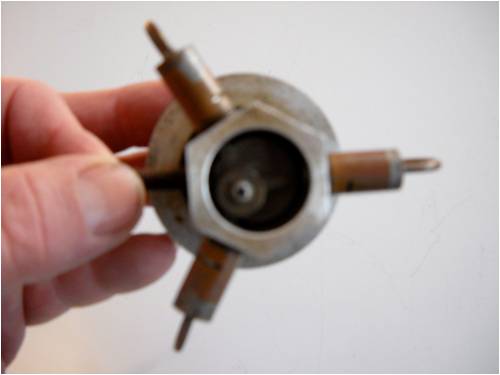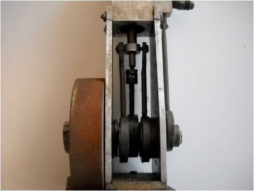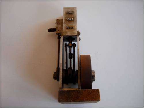 This engine has an "external" piston. The idea here is compressed air enters through the inside (look for a brass fitting) and it blows up a tube made of latex rubber. As the tube swells, it makes a bump and a roller is pushed ahead of the expanding rise in the rubber. At the end of the "stroke" the air exhausts through an open port on the inside of the central cylinder and the whole process repeats. It worked about as well as my 10-pound paper weight and now shares a coveted spot on the same shelf!