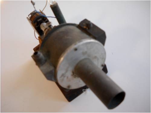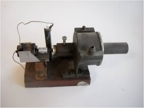 This is an attempt at a "turbine". Compressed air enters at the bulky center part, which spins a blade inside. The exhaust is at the extreme right-hand side through a large pipe. At the other end (left) is a direct-current (d.c.) permanent magnet (PM) motor. If you look closely, you'll see a little 1.5 volt flashlight (torch) bulb mounted on a little pipe sticking up above things (on a post). This little sucker will use up 50 gallons of compressed air in about 30 seconds. It's much the same as spinning a bearing with compressed air only safer, since the blade is enclosed.