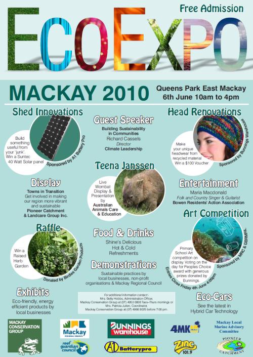 Hi Guys Here in Mackay Queensland Australia we have a Ecoexpo coming up in June. Its a chance for local "green" groups and businesses to get together and show their stuff to the general public. This year the the Ecoexpo is having a competition........ If you are in the Mackay region and interested in participating, you can find out more information by contacting Brooke McReynolds at mcgmail@bigpond.com I'll post more info as the event gets closer. I wont be able to contribute much at this event, which is a shame but I just dont have the time. But I will be there to mingle and I'm pretty sure Trev will be setting up a stall at the event too, so you could drop in and see him. Glenn The best time to plant a tree was twenty years ago, the second best time is right now. JAQ |