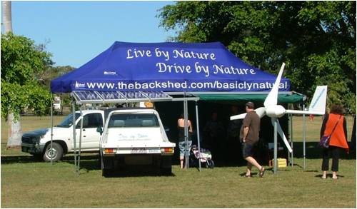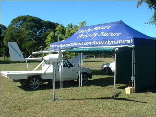 Thanks Glenn for running this thread. The last month has been very tiresome. Teaching, and organising new tools and machines for our new Trade Training Centre. We started moving in today. Still renovating the old Foundry space for Marcy's Live by Nature Clinic (its almost ready to move in). I have made a new foundry space. Organising the Eco Expo display. Hours of thought and work. Too many possible options. And keeping Drive by Nature customers happy. Just hav'n too much fun The Eco Exo. We had all the gear loaded and tied on already. Left home soon after it started getting light, the sun had not yet come over the mountain. Mackay is our ususal drive in the EV Hilux, about 45km to Queens Park. The marquee is very quick to put up, then there was the solar frames and fitting solar panels. Run the wires through the roof and a gust of wind picked up the marquee tipping it over. The solar panels went crash onto the back of the Hilux. Thankfully no solar panel damage. The only damage was the leg in the corner under the solar panels. It was a quick reaction to grab the marquee and pull it back and then hold it down and tie it to the trees there. Our neigbour exhibition (James, who used to own EV Blade Runner - sad story) kindly loaned his Hilux ute also to tie to. (He did not have a marquee). That sorted, we then finished setting up. We had everything set up in reasonable time. The solar setup with Thundersky Lithium Batteries, a fully functioning system, complete with inverter to run my laptop and TV screen with a slide show (took me forever to create that slide show), but was well worth the effort. The windmill was shorted inside, just a display, but caught the eye. It drew a lot of people. When they discovered that the Hilux was Electric, the excitement just grew. I was not far from the Toyota stand showing the new Camry Hybrid. Ford were supposed to be there as well, but I did not see them. There was so much interest. Some visiters came back several times bringing others with them. It was a really great day. I was very tired of talking by the end of the day. Marcy was too. The people from the conservation stand came over as we were packing up. They said that our stand attracted the most amount of people. I had 50 or so business cards (all gone) and there were way more people than that. We arrived home in the dark, with one small wire losing contact to the speed controller just a few Kilometers from home. It was hard to find in the dark, but after fixing it, all is good again. Trev @ drivebynature.com |