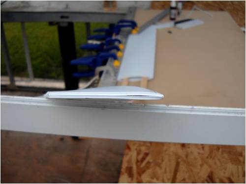 I weighed the one nearly-finished wing and it weighs 5.9 ounces even with the two spars. I plan on making a "receiver" in the welded-aluminum fuse to hold the wings with a small, nylon 1/4 - 20 screw on each side or maybe a snap-in detent pin; don't know which yet, to hold the wings on.