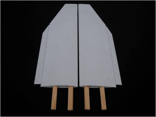 This will be a "wingeron" control system. That means it will have a stationary vertical stabilizer and no rudder and no elevators. Each wing has a larger-than-life aileron and the radio mixes the signals so that I can turn left and right and using the same two servo motors also make the craft go up and down. Just two flight servos control this pup.