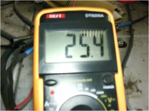 Float battery voltage of the bank while running a grid feed inverter with solar input. The batteries will be cycled to 28.5 volts once a week, I have found that with the desulphator in place there isn't so much need to go over 30 volts to equalize.