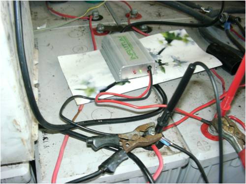 Here is the desulphator connected to the battery for 24 hours, as I have only one spare unit it has been a slow process to bring them up so far, when they are connected to the main bank they will have a dedicated 24 volt unit for a month or two.