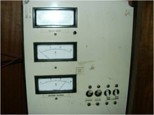 There is a pair of 80 watt solar panels with a 500 watt Chinese windmill and a 5 KVA auto start diesel generator as a backup. The batteries are 5 150 amp hour batteries powering a 12 volt Inverter 3500 watts.