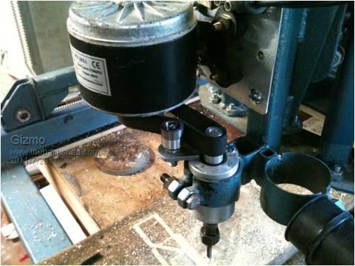 My original spindle and motor was borrowed from my mill, but it was too slow and heavy, so I bought a cheap Ozito plunge router. It had two problems, it was noisy and the spindle didn't spin true. The noise was just annoying, but the out of whack spindle meant I couldn't do any fine work. So I bought a cheap engraving tool for the fine work. It too, had a out of whack spindle! Just goes to show, you get what you pay for.