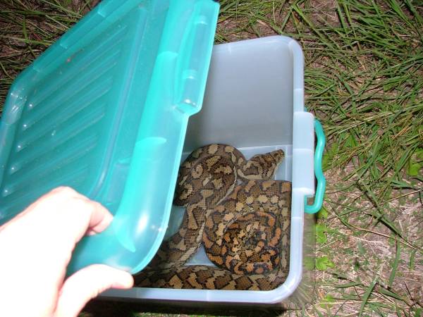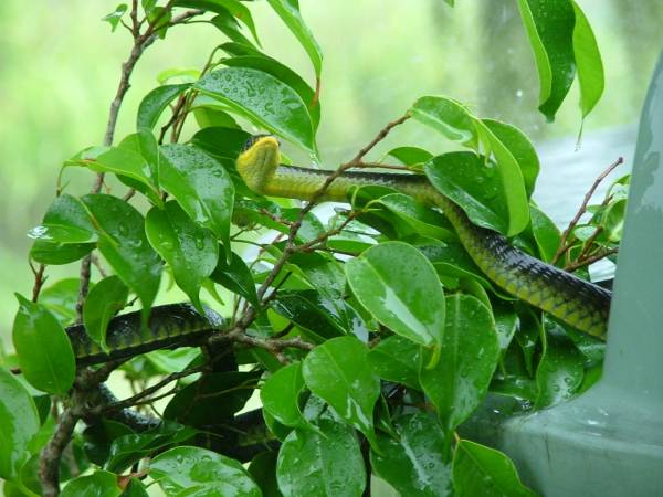 In the Ozy bush you do really have to keep a eye to the ground, the snakes here will kill you in less than 10 minutes, and the Taipan is a aggressive little bugger, will stand its ground or chase. If you see one of those the best thing to do is run, fast. But you learn to live with them, dont walk around at dusk, make lots of noise, watch where you put your feet. Here is a big python I caught last year, and a little tree snake.