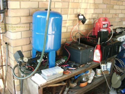 Hi All I got some photos to show the set-up ,it is a hay wire set-up as the first thing was to prove the concept. The pressure tank is a 20 Litre unit and it delivers around 9 litre of water. The regulator is swinging on the wire at the moment, I am going to mount on the wall, the volt and amp meters are just to monitor what is happening and the sequences of the regulator. The batteries are the ones I recovered a couple of years ago (battery rescue) and still going OK this application is making them better as the light cycling on the pump is better than sitting on the main battery bank, I am using desulphators on the batteries. The smaller battery is out of a gen set that sat for 12 months and was rescued also, it is a gell cell so it shows they can be used as well. I also used the battery to run my radio and CB. I run a lead to my car battery to keep it alive as it doesn't get enough use to keep it charged and it is running all sorts of things in the car all the time and the Jaycar desulphator also draws power all the time and helps to it to go flat. The other red jump starter battery is kept on here as it used a bit of mains power through it's plug pack charger, of course I forget to plug it in most times so the jump starter was at times to flat to work properly. The pressure controller I used was one of an old pressure pump, it has three contact sets rated at 11 amps AC so I connected all three in Parallel to make it last longer on DC, so far it is working and visual on the points doesn't show any arcing, so hopefully it will last. Set to shut off at 1.5 bar and cut in a .8 bar, it will work higher but draws more amps 7 amps as compared to 4 amps as set now. All the best Bob Foolin Around |