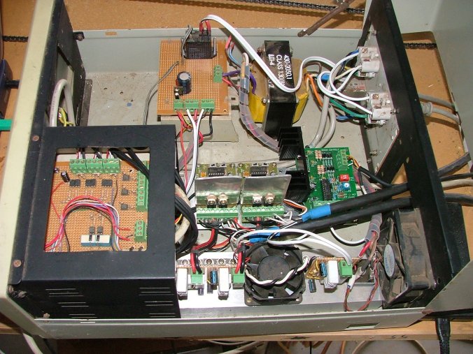 The electronics are housed in a old PC case. I want to upgrade the stepper driver boards, and will need more room so will move to a bigger case in the future. Its not pretty, but it works. The whole thing is driven from a PC using KCam software.