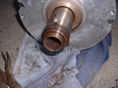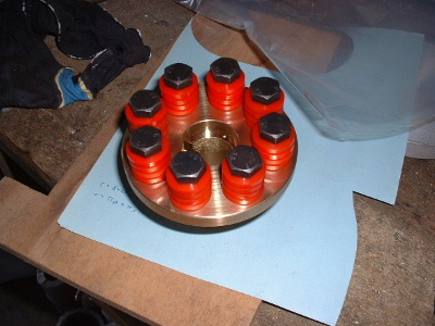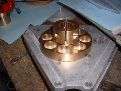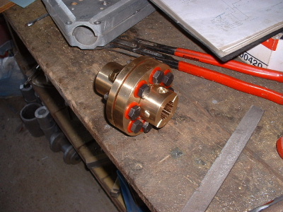 A new flex coupling was cast and machined out of Manganese Bronze. The part that fits the spline of the geabox shaft is clamped with 2 bolts through the sides. The part on the motor has a bolt in the end of the shaft. The only movement now is on the red washers, easily replaced. This is the same design as the coupling that we make for Foxcon, the connection between Subaru EA81 motor and reduction drive box on their aircraft.