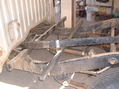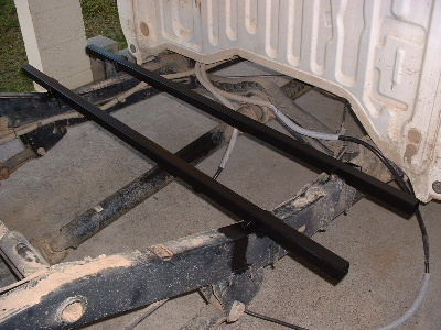 The steel mountings on the chassis was cut out and lowered, one at a time to be able to measure the new height. The new steel rails are welded in, same as before.