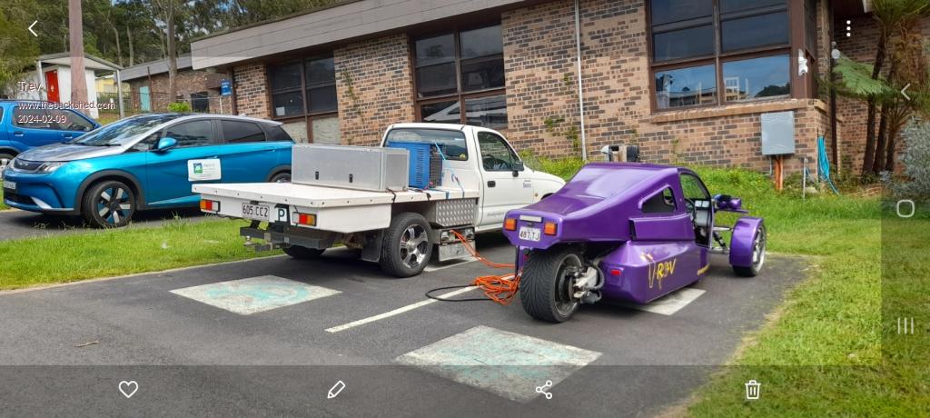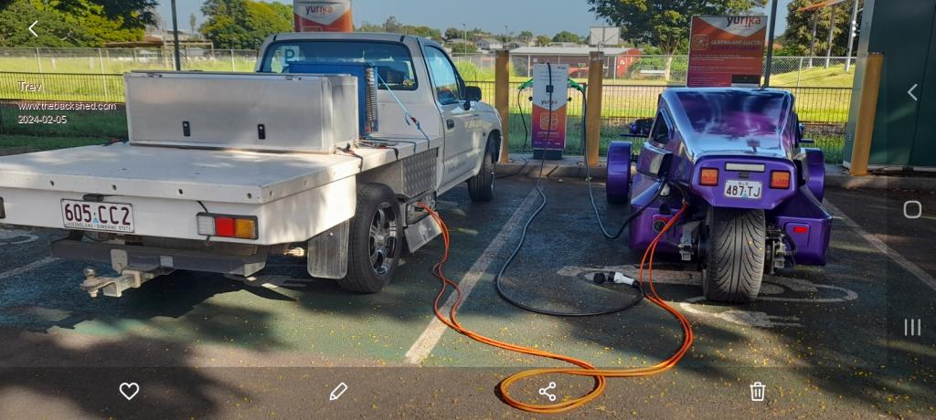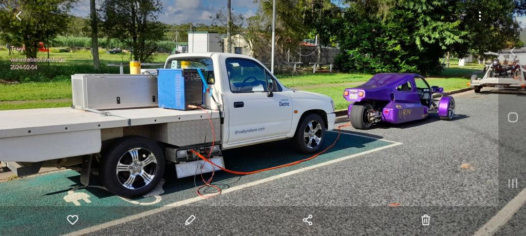 EV Hilux could not activate the charger at North Coast Power and Water, so connected T-Rev up and went to showgrounds with EV Hilux. Can't charge there because the electricians are upgrading all the power across the showgrounds. One motel said guests only. Another place said he was locking up in 1/2 hour. Boom gates block at the Uni. The shopping centre was barricaded off. A solar business said they just got a load of solar panels which are blocking access to their charger outlet. I couldn't dump charge from T-Rev chargers at North Coast Power and Water because it meant 2 vehicles parked together taking up too much space.