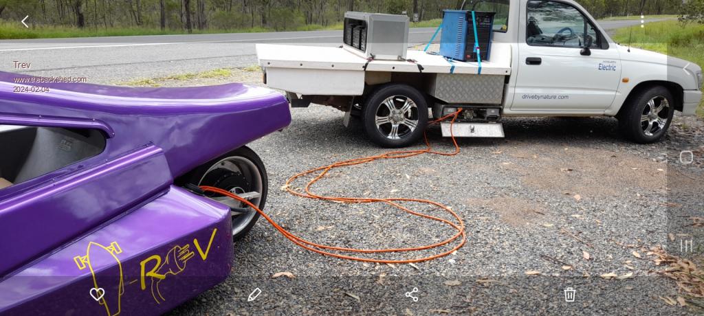 Plan B. Kaitlyn in EV Hilux, run the genny's to get enough. I thought I had enough power in T-Rev to make it, but 14km short. The battery was way too low to risk trying to make it. EV Hilux went ahead and picked up some charge and returned to dump power to T-Rev.