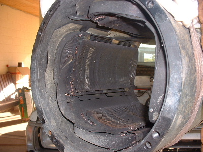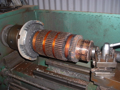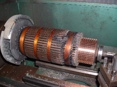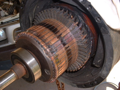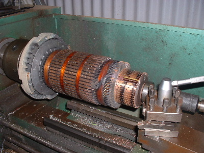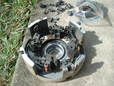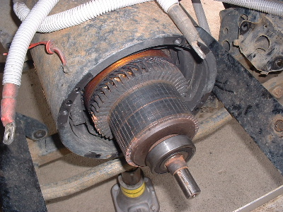 Looks like a starter motor I rewound out of a big grader a few years back. It can't see any reason why the pro's couldn't rewind it easily. Those string ties part way up the armature look to mean that the slots aren't captive slots,.. hence the need for the tiedown. Should make it very very much easier to rewind. It appears to be single turn wave winding, same as a starter motor. The only tricky bit I found was getting that "twist" at the output end right. If you don't pretwist your wire to the right angles, you will never get the last 10 slots in. If you get it right, it is a doddle, and you wonder what all the fuss is about (took me 2 days to work out the right angle and find success... I'm a slow learner.), but I had the captive slots, (and I had to make the copper bars from 3 in hand 2mm wire) so I could not place them in the wide slots like that one appears. (mine all had to slide up the slotlength) I'm not sure I would blame the advancing just yet, unless perhaps that motor was wound advanced, and your extra 6 degrees was then over the top advanced... but that's unlikely, as it would mean very poor reverse (unless your using the gearbox for this). I would expect that type of motor to be designed to perform well in either rotation. If it was better one way than the other, it may well have been biased already.... like a vacuumme cleaner motor. They are already near 2 full segments or so advanced. They will burn out in reverse if you rewire the fields to go backwards.... unless you shift the brushes about 4 segments back at the same time. I agree with Bob, something did not do those field shoes any favours...... I'm more inclined to blame the worn brushes for messing things up. If you lose one, you run on 2. You then draw the same (or usually much worse) current, and get less power out.... More in and less out = burn out... and thats not talking about the physical damage the copper wires in the dying brushes are doing dragging and spot welding onto the armature.... and possibly bits lodging themselves in between the armature and the field shoes.... maybe that explains the copper bits that appear to be stuck to the shoes in the pictures. Not pretty at all..... now I will have to go out and check mine. My few thousand Kms have all been done in the paddocks.... It won't be so embarrassing when the cows see me push it when the time comes. ......oztules Village idiot...or... just another hack out of his depth |