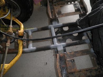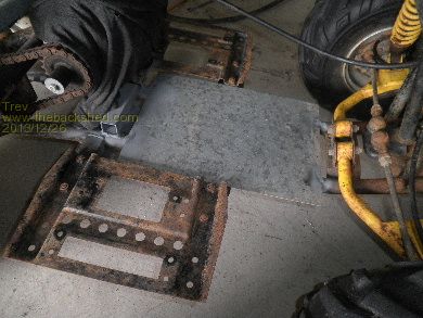 We pushed it outside to gerni it all clean. Then back in to work out all the positions of components. Some brackets that will not be used were in the way for mounting the motor, so they were cut and ground off.