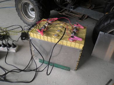 Then it was on to the battery pack mounting. This was quite simple. The frame had to be leveled off some and fitted with a flat bed to sit the battery pack on. The flat galvanised sheet was welded to the 4 wheeler frame. The angle at the bottom of the battery pack, screwed to the side alloy strapping plates, simply bolt through the foot rest frame. With that sorted, the cells were then set up for charging and balancing. All cells connected in parallel and charged with 5 x 3.7v chargers, giving 20A charge rate. These cells are 260ah.