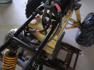 The speed controller was bolted to the 4 wheeler frame where the fuel tank used to be. To start with we had the terminals facing forward, but just couldn't get the cables to work neat enough. I am using old cables that came out of the EV Hilux. Ended up removing an old fuel tank bracket, and turning the speed controller so the terminal face backward. The problem with terminals facing backwards was that the seat has to mount under the steel strap there on the frame. The cables had to be kept back from that seat bracket, but worked so much better. The seat still works. No new cables were made. All the high power cables are connected. The dual battery switch is used as precharge through a resister on "number one leg". On "both leg" and "number 2 leg" the high power can flow. The switch is rated for 300amps continuous and 400amp max intermittent. It should handle it. The speed controller is 400amp, but should not need that much to get the 4 wheeler rolling.