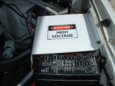 A cover was made for the high power electrical corner under the bonnet and 'Danger High Voltage' sticker place on top. The rear storage box also has high voltage also, not easily accessable, but still is there. A sticker has been placed on the charger for a warning. Trev @ drivebynature.com |