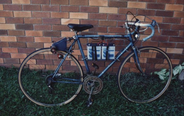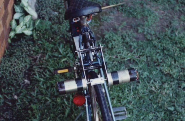 I made this about 15 years ago. The two motors were from old Telecom Telix machines, about 100 watts each. They share a roller drive on the back wheel, the whole assembly held against the tire with a simple shock absorber made with a Datsun engine valve spring. Power was from a couple of motorbike batteries, 24v in total. The control was simple, basically two speeds with the batteries either in series or parallel to give 12 or 24 volts. I remember it worked pretty good. I used the bike to go to the corner shop every evening, about a 2km round trip. The batteries needed charging every couple of weeks. Top speed was 20khm. The motors didn't have a lot of power, they could accelerate the bike from standstill, but hills were a no no. Puddles of water were a problem, the roller would slip and spray water up my back! It was a fun project. I still have the bike, but the EV bits are long gone. Glenn The best time to plant a tree was twenty years ago, the second best time is right now. JAQ |