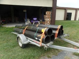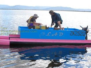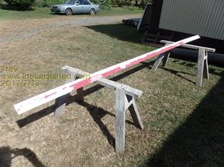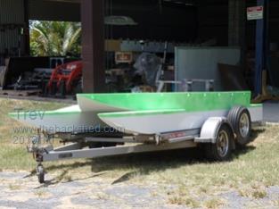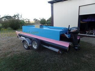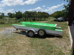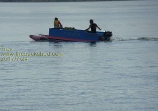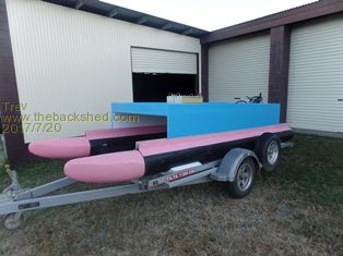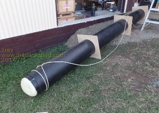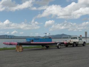 My Dad and I set up the 2 lengths of pipe in the car park to the boat ramp. And then to launch it. I didn't get a photo of what it looked like after we took out the timber boxes as props for assembly, but the trailer at less than half the length of the boat, the pipe sagged plenty and almost touched the ground.