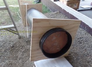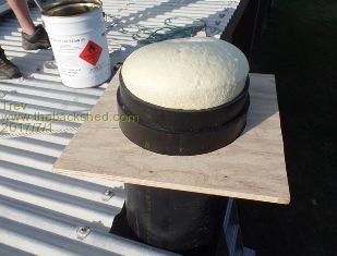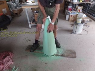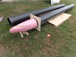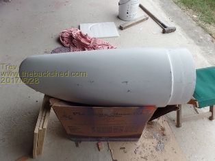 With nose cone glued in, we then stood the first pipe up on the shed roof and filled with foam - a 2 part polyurethane foam mixed as liquid and poured in. The pieces of ply were there to help in holding the pipe round.