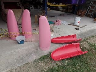 This is another Dad and son (& son) project. We set about making a cone shape plug from polyurethane foam. Cut rough pieces and glued them together, then sanded out the shape. Sprayed with flowcoat and sanded that off to a reasonable smooth surface. Then take a mould off this shape and make 4 cones from the mould - 2 for the front and 2 for the back. Glued one cone in the first pipe.