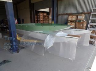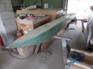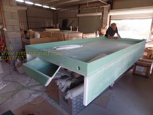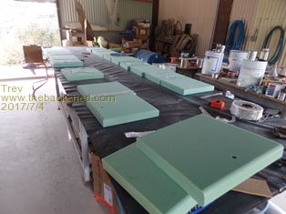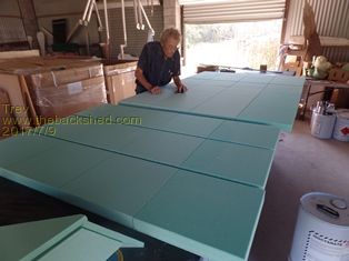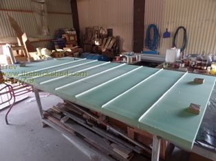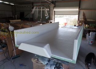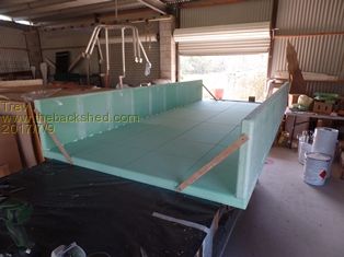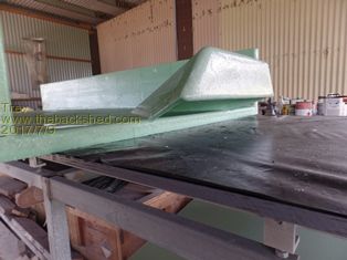 Cut 50mm structural foam, routered corners, drilled holes and filled to add strength where bolts will go through. Joined up the foam with 50mm fibreglass between joints to add strength. Glassed over the first side.