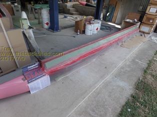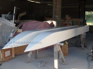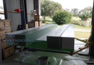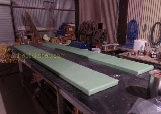 Middle section is now complete, ready to put the pontoons on, but a little more patching of some holes in the top of the second pontoon to do, before that can happen. I need the top of the foam to be flat because the top will just have a fibreglass skin straight on the foam.
