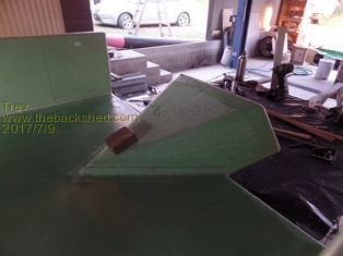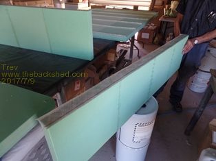 With fibreglass on only one side, we put them aside and started the deck. More cutting and joining up with the 50mm fibreglass tape as ribs to strengthen the structure. All the long ways cut and joined and then cross ways cut and joined. A grid of stiffening ribs.