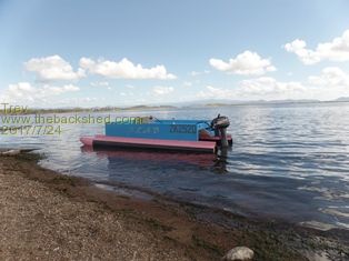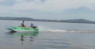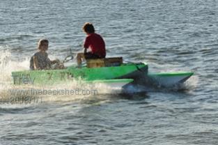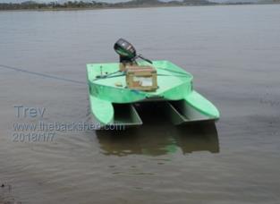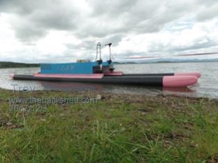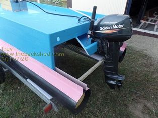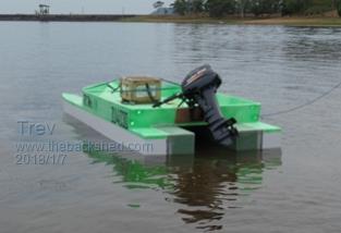 The water over the transom (motor mount) was no different, the water though the tunnel still hit the outboard leg and shoots up over the transom (motor mount board). It can't sink, the water just runs back out the holes. Next is to lift the motor higher. The boat was definitely faster with the double pontoon. It felt like it was getting up on the plane. The pontoon transom cleared of all water at 11km/hr and 61A, battery voltage 52v.