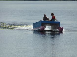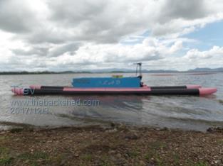 We swapped the motors. Golden Motor removed, we put on the little pod motor that I tried with our solar canoes. This is the results with the pod motor. All 3 of us still on board.