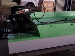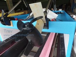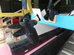 Turned the body over and had to check out how the electric outboard motor would sit - see if we had our measurement right. Should be pretty good. Have to thicken up the mounting board as the motor clamps don't wind in that far.