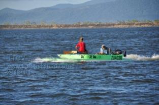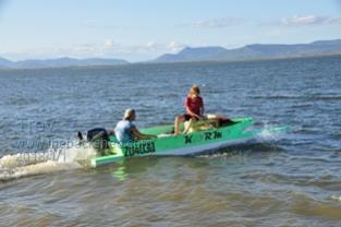 The Golden Motor 10kW outboard is a very nice motor. The motor has a fair bit of weight, but I don’t know, a comparable petrol outboard may be similar weight. Two people on board, I am in the back. I am not much weight but still all adds up. The more power on, the deeper the back of the boat sinks, therefore creating more drag.