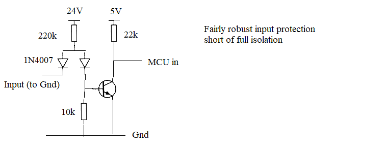 The Arduino Portenta Machine Controller (available at Mouser, Farnell, etc.) accepts the industry-standard 24v DC input levels via voltage dividers only. Of course, inputs from external equipment would require opto-couplers to avoid tying grounds together. Manual attached. Portenta Machine Controller.pdf |