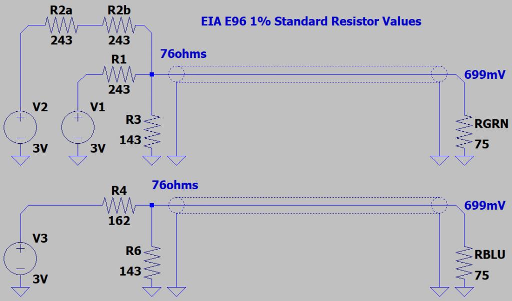 Impedance match is only important for long cables - tens to hundreds of meters. No visible problems on short cables. Clipping diodes are only needed on very old cheap CRT monitors that have inadequate beam current limiting. I have not found a LCD monitor that can't cope with up to 1.5V. With just a 220 ohm resistor in series with the 75 ohm input, I measure a Pico pin voltage of 2.2V. This gives a pin impedance of around 150 ohms, something to add to the circuit simulation. |