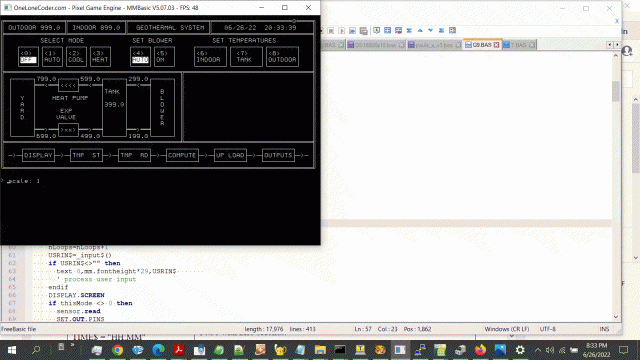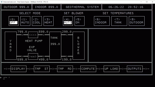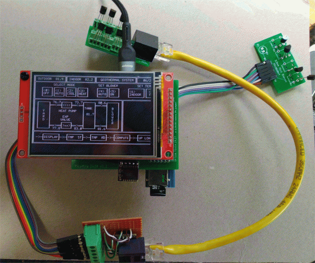What is displayed is a first pass at Paul_L's geothermal controller display with PC line drawing type graphics. Temperature readings from the 10 DS18B20s change every second.