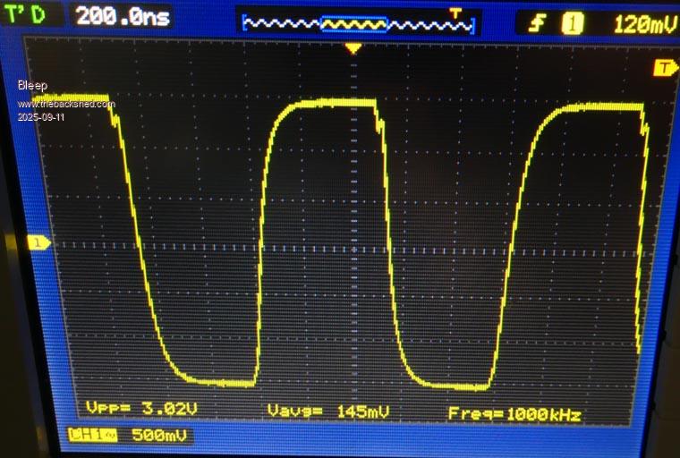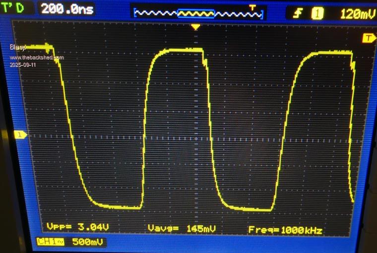 Kevin, If you do not want to solder a new opamp.... The problem is that in square wave mode the input of the opamp is driven with 2.5V input signal (211/256*3.3V), and the opamp has a gain of 6x (the 9833 sine and triange wave signals are small signals, the square wave is huge (rail to rail). So the opamp input is over saturated, causing this type of distortion. If you (software) limit the input signal to the opamp in square wave mode, the opamp amplifies linear. I have managed that by adding 1 line in the program to send a different setting to the attenuator, while keeping the display at 100%). ![]() You will not see a perfect square wave, since the opamp operates in linear mode, and this opamp (AD8051) has a small signal bandwidth of 110/6=18MHz. Large signal bandwidth is typically less. To get a better square wave, we need a faster opamp. i.e. a OPA356. But this may be good enough for many. Regards, Volhout PicomiteVGA PETSCII ROBOTS |