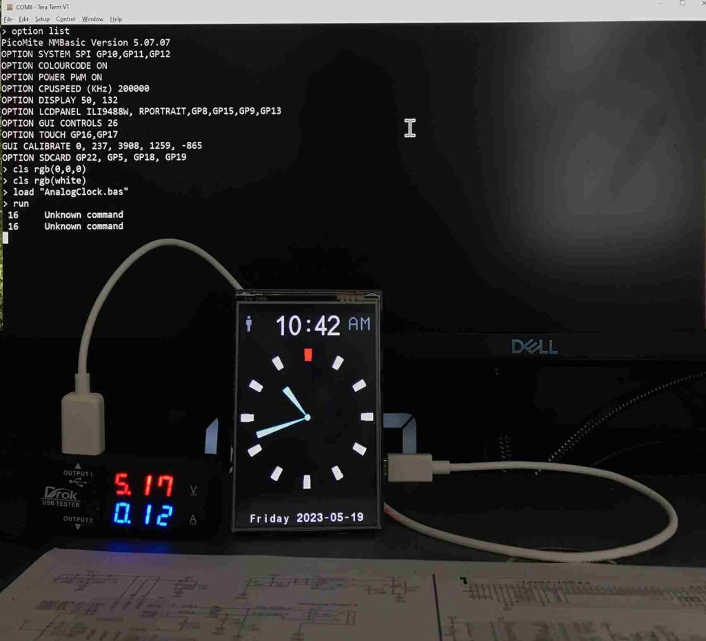 * The PicoW, though it uses most of the other peripherals just fine, fails to initialize the touch circuitry correctly on both. When I run GUI TEST TOUCH, the LCD display goes white, targets are *not* displayed, and it doesn't respond to me touching the screen. I have to exit the test with a Ctrl-C, which returns control to the terminal session, but does not clear the screen. Subsequent program execution (of the clock code, above) runs normally, not requiring a restart.