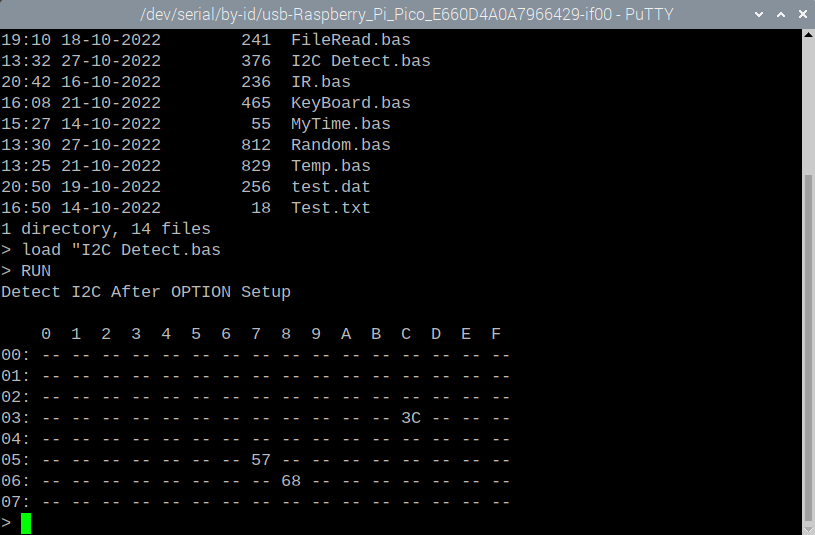Hi Pekka; You are almost there. I use these options but you may need to adjust for the GP pins you use; option system i2c gp16,gp17 option lcdpanel ssd1306i2c, landscape These options are made at the command line, your PICO will reboot after the 1st option and I am not sure possibly after the 2nd one too. Here is a simple program to display the time on the display. ' BigClock.bas largest font for SSD1306 ' That fits on 128*64 CLS 'This blanks the SSD1306 Display Do ' Text X,Y,WhatToDisplay$,Landscape,Font #3 Text 0,20,Time$,L,3 Loop I have an RTC on the same I2C bus as the SSD1306 and I used option rtc auto enable to have the date and time read when the PICO starts. My assumption is that it knows the address because of that. ![]() The clock is at H68, Memory at H57 and Display at H3C. The only thing I have to address in a program is the Flash Memory. The rest just works. Good Luck Pekka You can ask lots of questions here, this forum rocks with great support. Hans ... ![]() Edited 2022-10-29 02:28 by Hans |