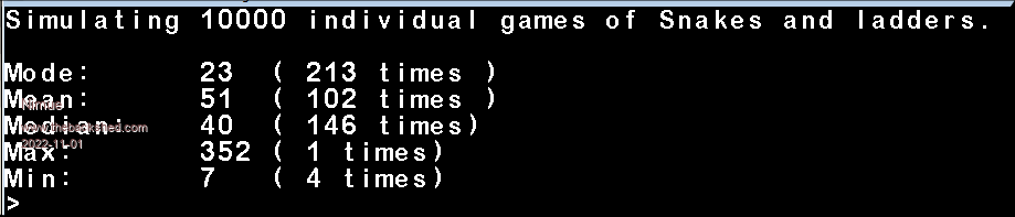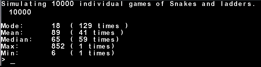 Nice - worked a treat. Thankyou -- some nice explaining for students on how this works. The index of an array found from the value in another array. Nice. In the board designed below - interesting to see the range of rolls. ![]() edit: edited to return the index of the bin (ie roll value - and not just the count) ' Snakes and Ladders simulation ' Start off the board (position = 0) ' Only end when landing exactly on 100. If over roll, move back ' the surplus amount. So on 99, roll 4 (=103). Move forward 1 + ' (=100) then back 3. Final square = 97. option base 1 ' Board starts at square 1 option default integer 'variables integers by default dim board(100) dim bins(500) dim binindex(500) ' Pre populate board with squares that equal its number for x = 1 to 100 let board(x) = x next x ' load in structure of snakes and ladders for y = 1 to 18 read start,finish let board(start) = finish next y 'reset rolls and set number of simulations let roll_total = 0 let maxit = 10000 '10,000 gives a consistent overall average dim rolls(maxit) print "Simulating"maxit " individual games of Snakes and ladders." 'set up the simulation for runs = 1 to maxit let position = 0 ' start off the board let currnetroll = 0 do 'individual games currentroll = int((rnd*6))+1 position = position + currentroll if position = 100 then exit do if position > 100 then position = 100 - (position - 100) position = board(position) rolls(runs) = rolls(runs) + 1 'keep count of number of rolls loop while position <100 bins(rolls(runs)) = bins(rolls(runs)) + 1 next runs roll_mean = math(mean rolls()) roll_median = math(median rolls()) roll_max = math(max rolls()) roll_min = math(min rolls()) sort bins(), binindex() roll_modal = binindex(500) print"" print "Mode:"roll_modal, "Mean:" roll_mean, "Median:" roll_median, "Max:" roll_max, "Min:" roll_min 'ladders and then snakes 'data 5,23,7,55,13,31,20,39,33,69,37,86,57,83,61,99,71,92 'data 45,9,47,11,63,43,74,49,77,51,81,26,88,3,94,53,96,41 'board 2 data 5,17,13,31,21,37,28,64,48,52,54,91,62,98,76,86 data 26,7,33,10,57,53,59,24,67,36,71,49,77,41,84,61,92,73,97,66 Edited 2022-11-01 21:18 by Nimue Entropy is not what it used to be |