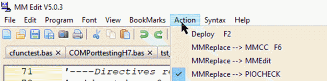The MMReplace --> MMCC option will load the processed code directly to the Picomite via MMCC, comments will be removed. If any syntax or out of range errors in the PIO source are detected the code is not loaded and a window will open to show the errors.