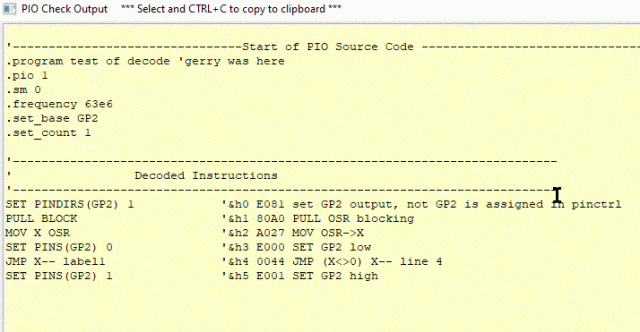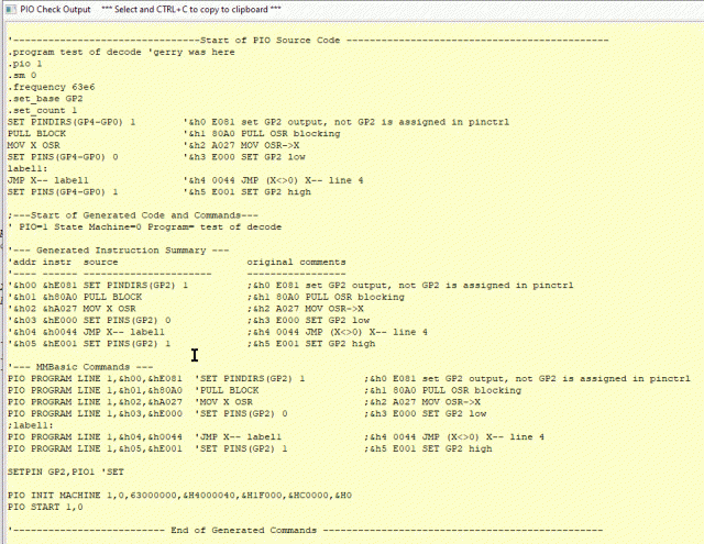 This will not load to either MMEdit or MMCC, but will only process the PIO source and display the result in a window. This is meant to help in development of PIO code. The window will show the resultant generated PIO code and MMBasic commands as well a display any syntax errors or out of range parameters detected.