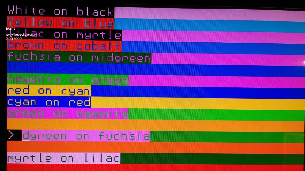 Text 0,24,"lilac on myrtle",,,,RGB(lilac),RGB(myrtle)