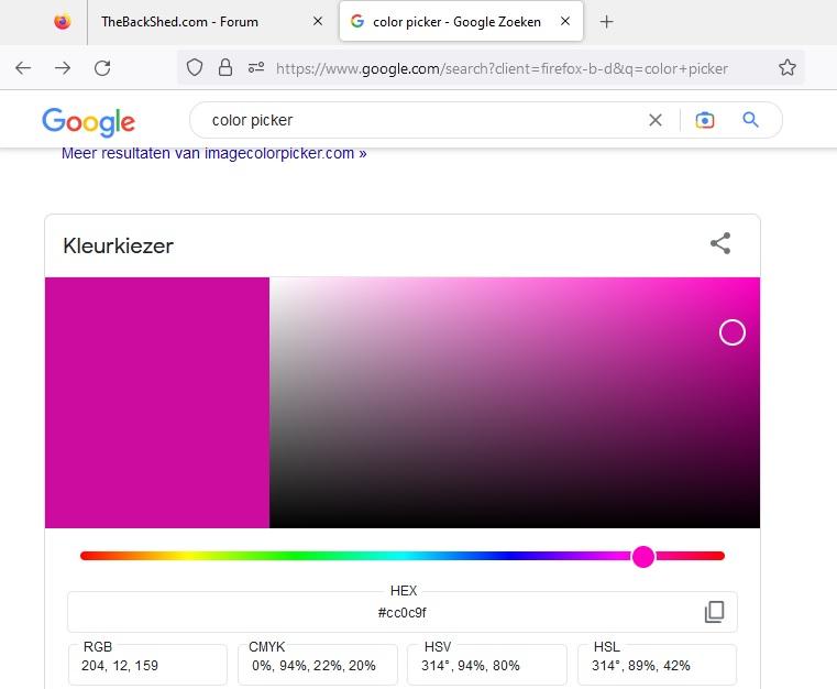 Move the dot and slider and you can pick any color you want and get RGB, CMYK, HSV and HSL values.