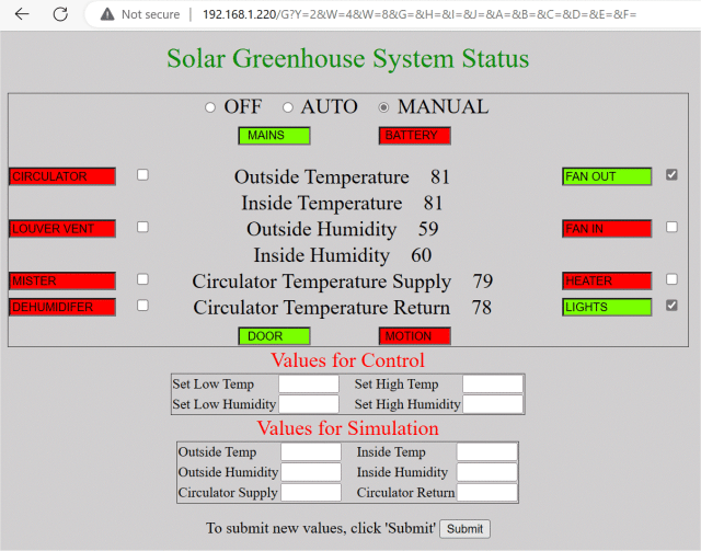 Note that neither the HTML file nor the greenhouse.bas program make good examples of best use of the PicoMiteWeb capabilities, since their origin precedes even Peter's implementation on the Pi-cromite, which introduced the practice of including the MMBasic variables in the html file enclosed in "{}". I used a method I started using on the PICAXE many years ago of embedding "tags" (~01 through ~99) in the HTML, and then programmatically replacing them each time the HTML was reproduced. I hope at some point to align with Peter's method, but it's a fairly major rewrite for me.