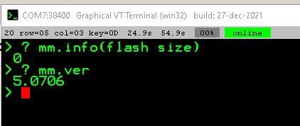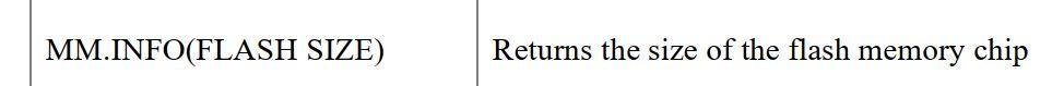 mm.info(flash) returns the flash slot currently running a program - normally 0 mm.info(option flash size) returns the size of the flash memory chip |