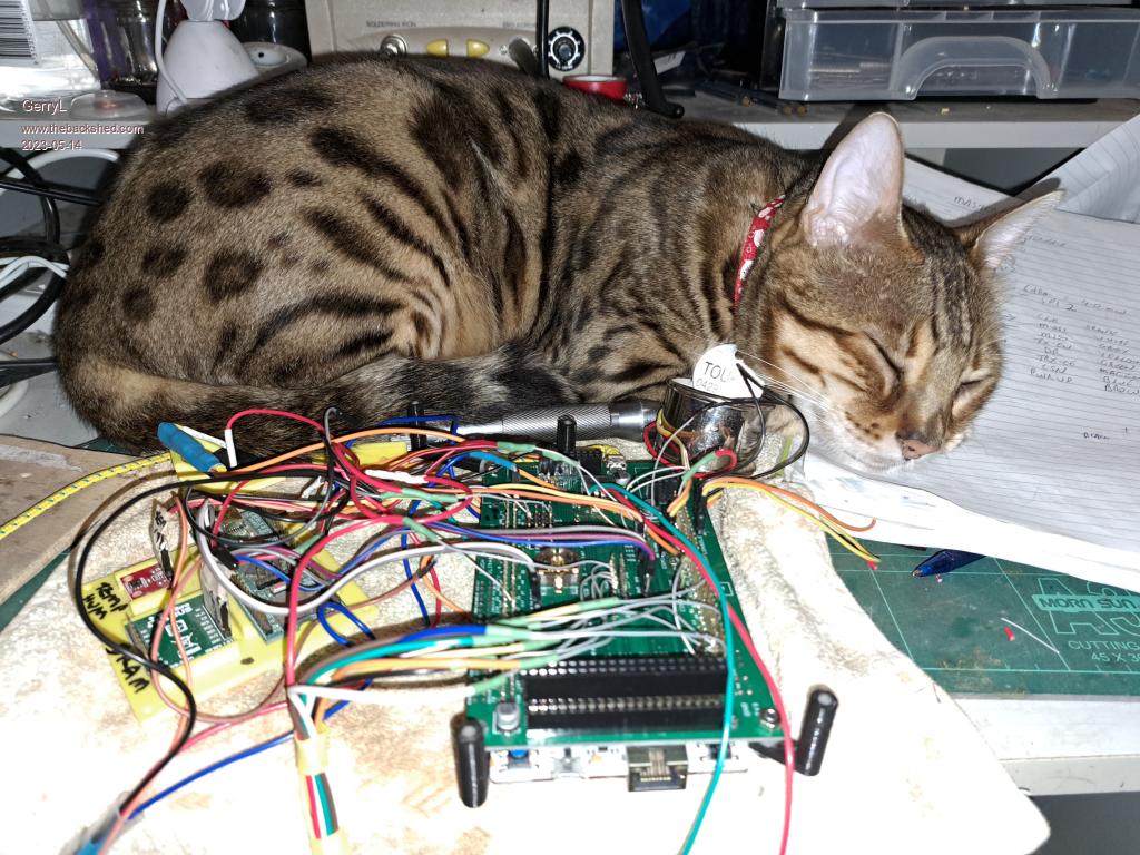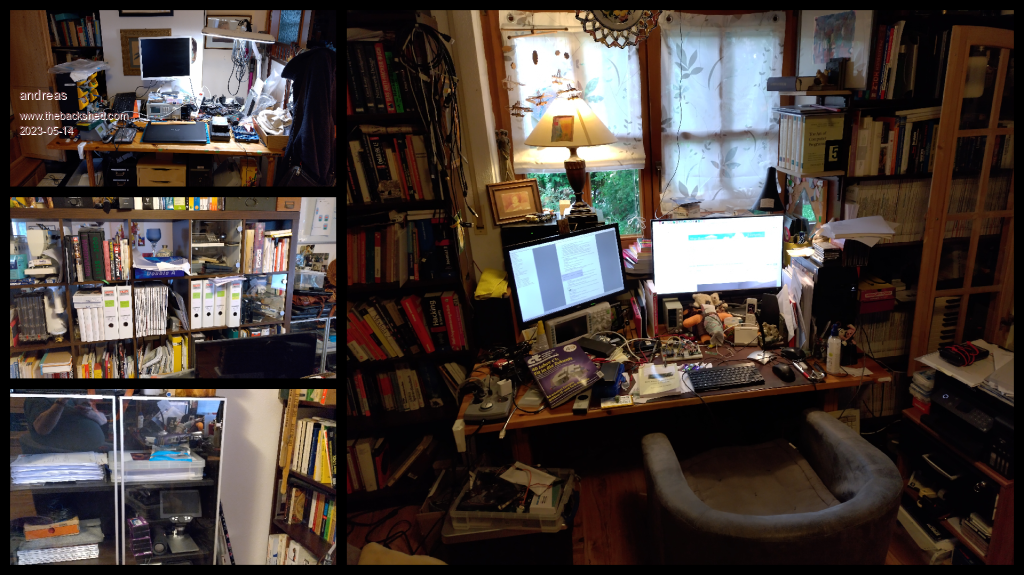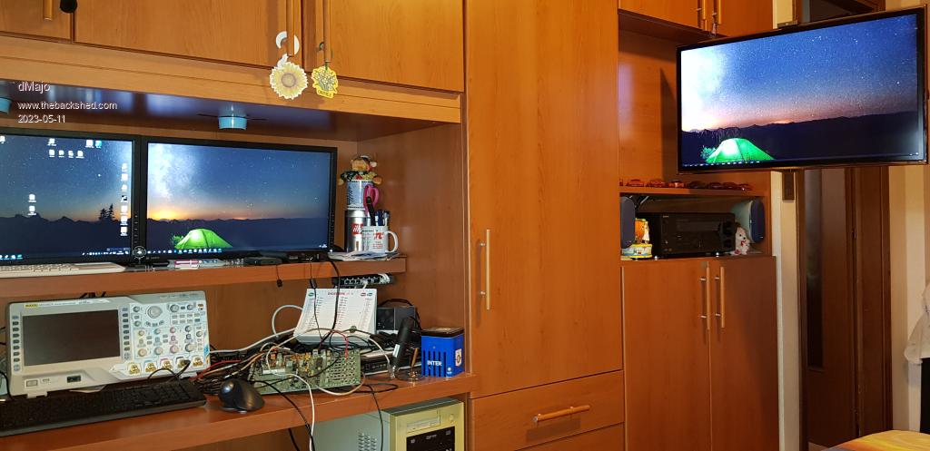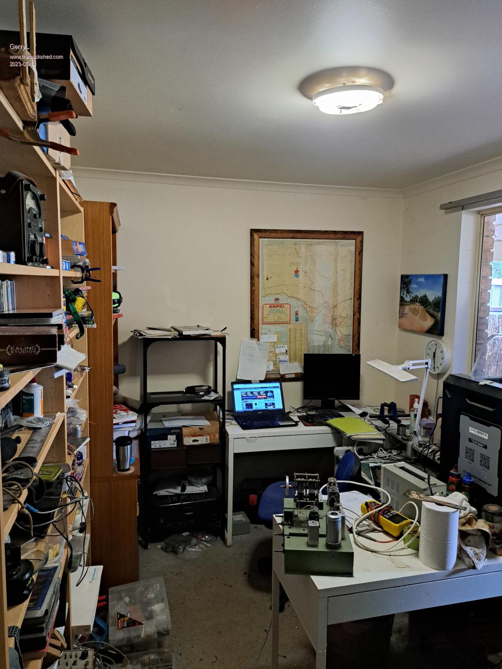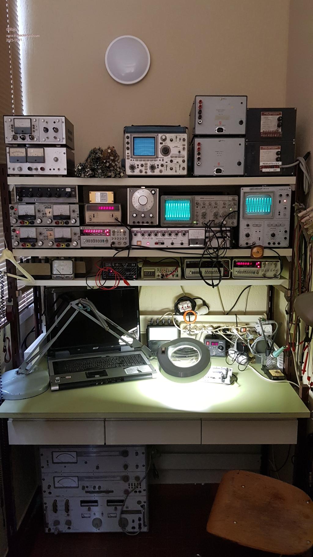 My messy workroom, complete with trip hazards, note the late 1930's 5 gate processor on the bench in the foreground, it does a good job of simulating an AM radio.