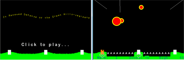 Here is VegiPete's "Renewed Defense of the Green Hills" #2, (a variation of Missile Command) converted from CMM2 for the PicoMite using an ILI9488 for the display and touch instead of a mouse. I had previously converted it for an LCD on the Armmite F4, but there were still some changes required.