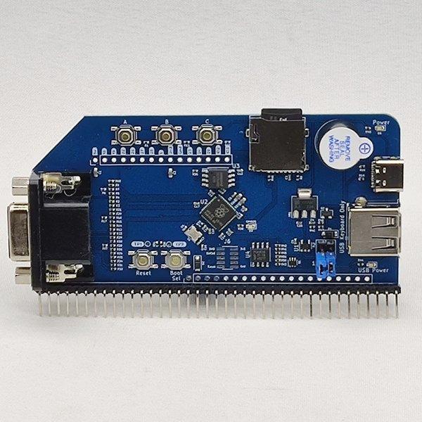 It supports a USB keyboard and SD Card. PicoTerm supports 80 by 30 text in several colors and a 40 by 20 mode. Here's a picture of the SMD version.